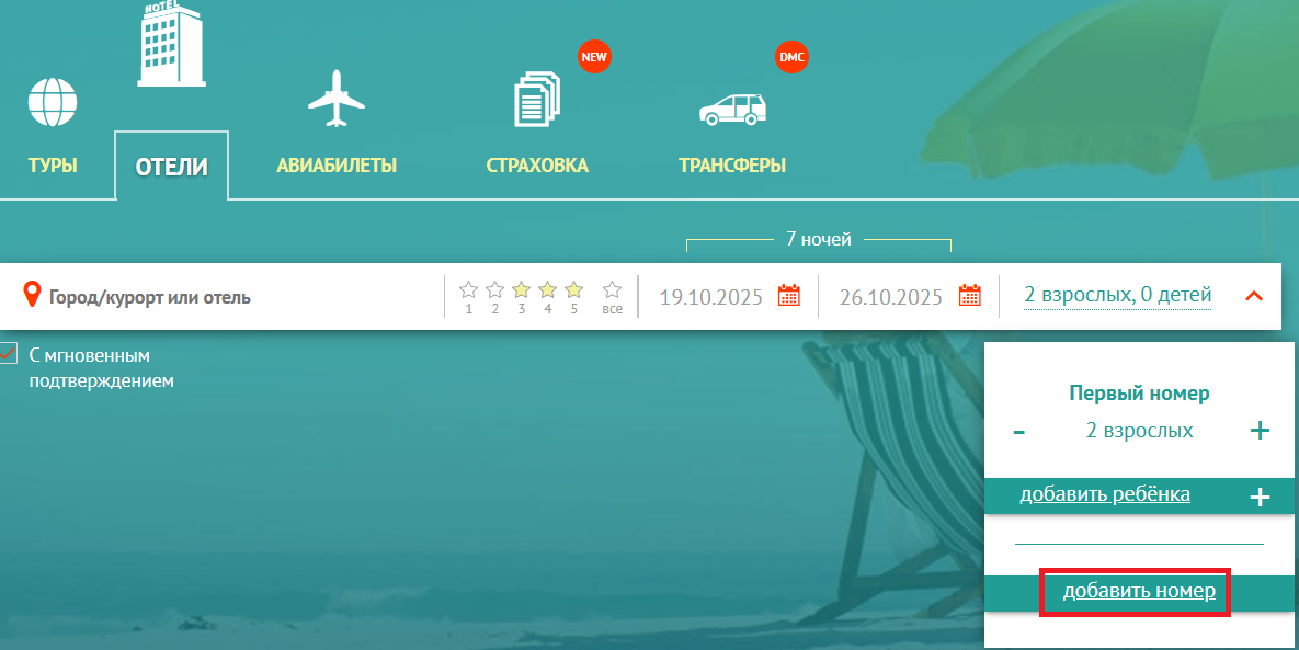 Для просмотра наличия сразу нескольких номеров в отеле на платформе реализована опция «Мультибукинг», где вы можете выбрать одновременно до четырех номеров одной категории. Чтобы воспользоваться опцией, при выборе количества туристов в строке поиска нажмите «Добавить номер».