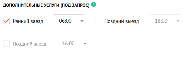 На этапе заполнения данных туристов в корзине вы можете выбрать дополнительную услугу, указав нужные вам значения. Обратите внимание: услуга предоставляется под запрос за дополнительную плату после согласования с объектом размещения. Для гарантированного получения услуги «Ранний заезд» или «Поздний выезд» вы можете оформить дополнительные сутки проживания.