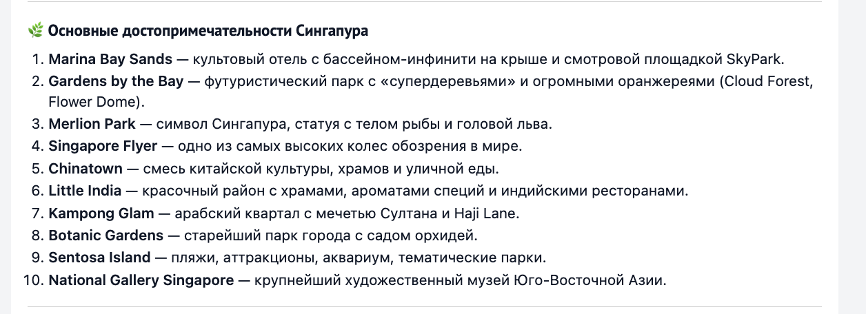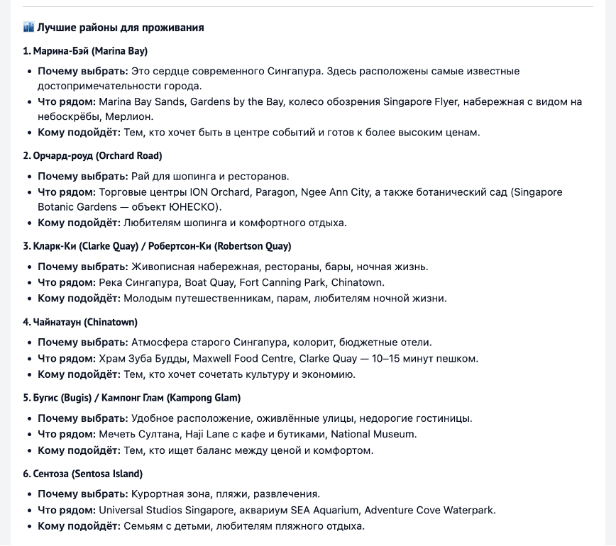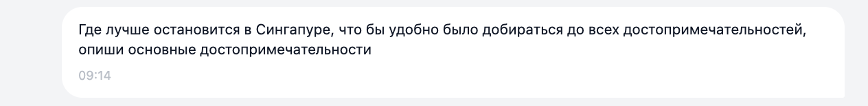 Пример: Где лучше остановиться в Сингапуре, чтобы удобно было добираться до всех достопримечательностей, опиши основные достопримечательности