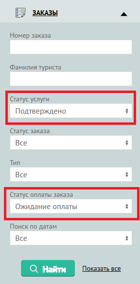 Выставьте в личном кабинете справа в фильтрах Статус услуги – «Подтверждено», Статус оплаты заказа – «Ожидание оплаты».