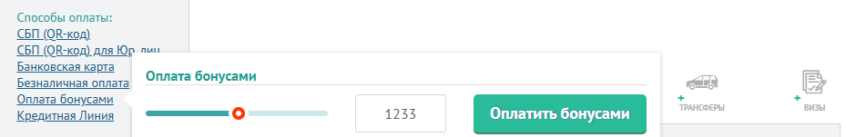 Вы можете списать кешбэк на любой заказ в нашей системе, кроме заказов с авиабилетами, по кнопке «Оплата бонусами» под номером заказа. Вы также можете выбрать нужную сумму списания.